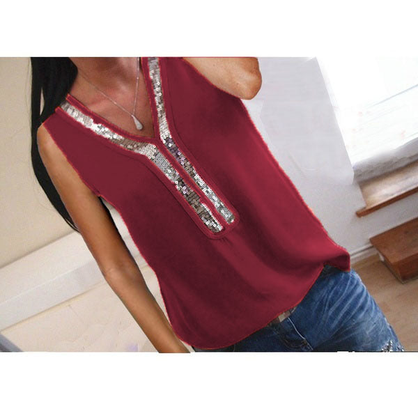 Gender: WomenItem Type: TopsTops Type: TeesPattern Type: SolidStyle: CasualSleeve Style: REGULARBrand Name: Liva girlSleeve Length(cm): SleevelessMaterial: Cotton,PolyesterDecoration: SequinedClothing Length: REGULARCollar: V-NeckFabric Type: BroadclothModel Number: H3022colour: Black, gray, khaki, white, blue, orange, wine redsize: S,M,L,XL,XXL,3XL,4XL,5XL