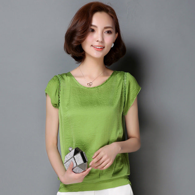 Brand Name: Liva girlMaterial: Polyester,SpandexClothing Length: REGULARStyle: CasualFabric Type: BroadclothSleeve Length(cm): ShortDecoration: LacePattern Type: SolidCollar: O-NeckSleeve Style: REGULARModel Number: 12141Place Of Origin: China (Mainland)Gender: WomenProduct category: Chiffon shirtsize: M,L,XL,XXL,XXXLContent of fabric 2 components: 10%-29%